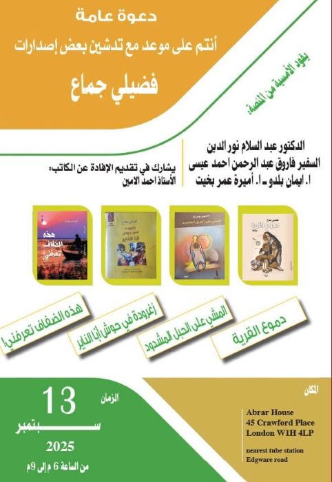 تدشين بعض إصدارات فضيلي جماع 22 أغسطس, 2025 فضيلي جماع 596 زيارة شاركها Facebook Twitter أخبار أخرى “صمود”.. وهتافات ثورة ديسمبر في قلب لندن !! 4 أسابيع مضت (يا محمود نكاد نراك) شعر 19 يناير, 2026 عيناك ضوء المصابيح 11 يناير, 2026 شاركها Facebook Twitter