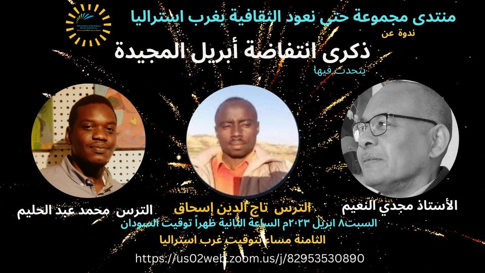 أكمل القراءة »ندوة عن ذكرى انتفاضة ابريل يتحدث فيها: الأستاذ مجدي النعيم، تاج الدين إسحاق، محمد عبد الحليم بمنتدى مجموعة حتى نعود الثقافية بغرب استراليا