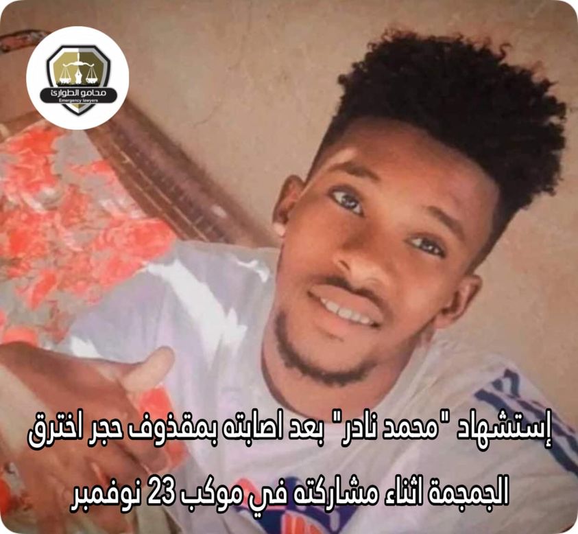 محامو الطوارئ: انتقل الشهيد محمد نادر “فابلوص” مساء الجمعة الى جوار ربه بعد اصابته بمقذوف حجر اخترق الجمجمة بحسب مصادر لجنة الاطباء المركزية و ذلك يوم الاربعاء 23/نوفمبر بأمدرمان شارع الشهيد عبد العظيم اثناء مشاركته في موكب 23نوفمبر ، و لقد تم اسعاف الشهيد و أجرت له عدة عمليات جراحية و مكث يومين بالعناية المكثفة الى ان فارقت روحه الطاهرة …